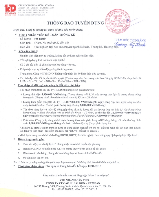 Thông báo tuyển dụng của Công ty CP Cao su Sài Gòn - KYMDAN (Chi nhánh Cần Thơ)