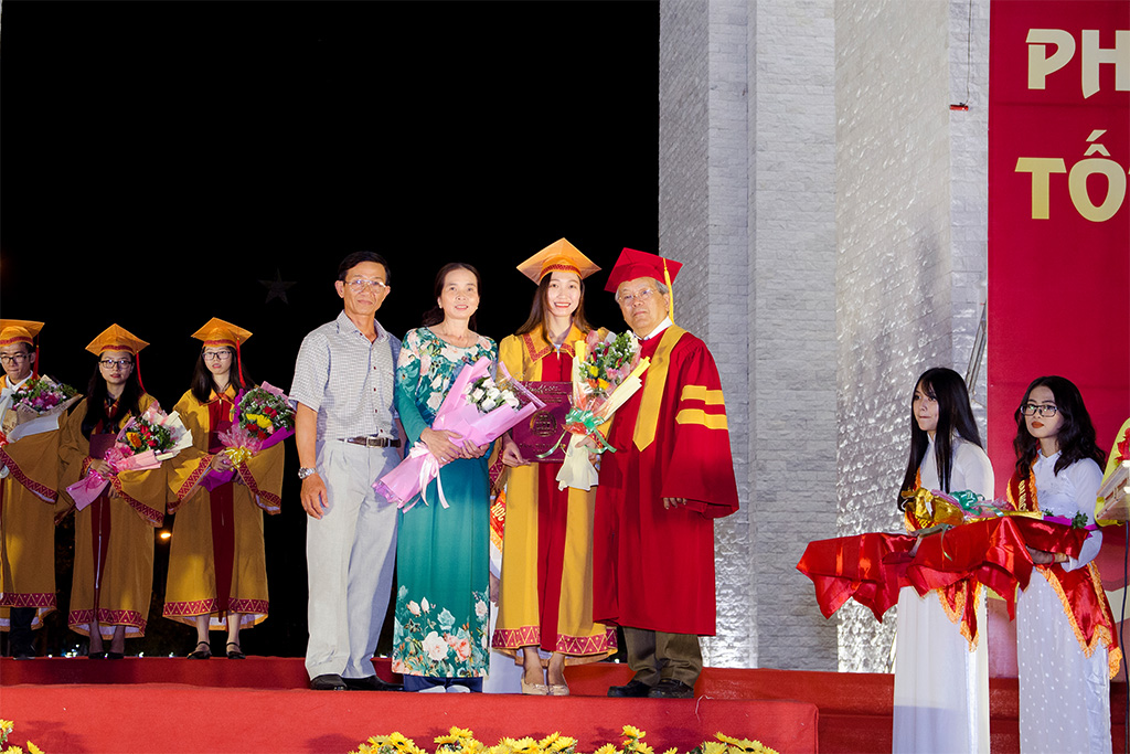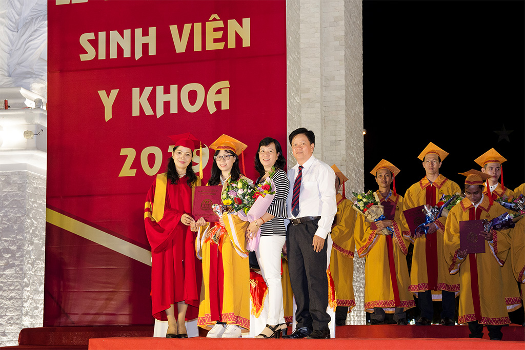 Theo nghi thức, các tân sinh viên trong trang phục áo mão cân đai chỉnh tề, lần lượt lên sân khấu nhận bằng tốt nghiệp từ tay thầy Hiệu trưởng nhà trường TS. Dương Đăng Khoa; Hiệu phó nhà trường là PGS.TS.BS - Thầy thuốc Nhân dân Trương Văn Việt, Nguyên Giám đốc Bệnh viện Chợ Rẫy – TP HCM; Hiệu phó nhà trường là Tiến sỹ.Dược sỹ. Lê Ngọc Kính; Trưởng khoa Y nhà trường là PGS.TS.BS Lê Anh Thư.