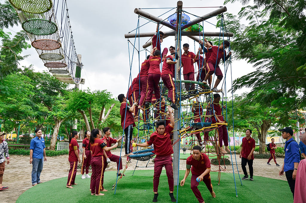 Sinh viên tham gia trò chơi hành trình mạo hiểm trên cao (High Ropes Course)