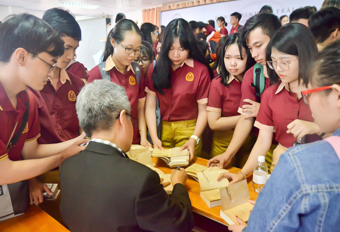 Với sự mến mộ của hàng trăm sinh viên, PGS. TS Trần Hữu Đức đã nán lại để giao lưu, chụp ảnh và ký tặng tên lên những quyển sách mà các bạn trân quý.