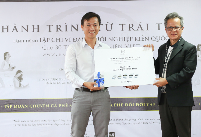 Thầy Lý Huỳnh, Bí thư Đoàn trường nhận sách từ Tập đoàn cà phê Trung Nguyên